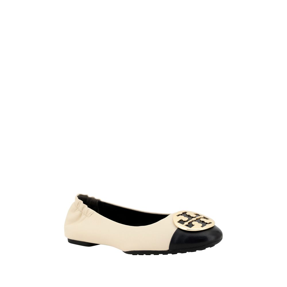 Leather Claire Ballerinas by Tory Burch, two-tone design with contrasting round toe, three-dimensional plaque with iconic brand logo applique on front, elasticated heel.
