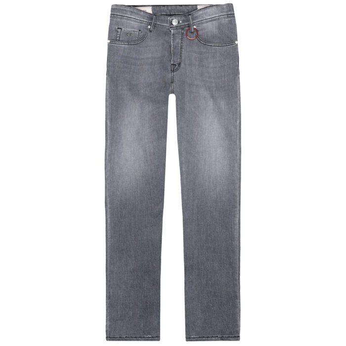 Tramarossa Michelangelo jeans in grey cotton with used effect, black stitching details, five pockets with removable initials on the pocket, front zip and button fastening, smooth red leather label on the back