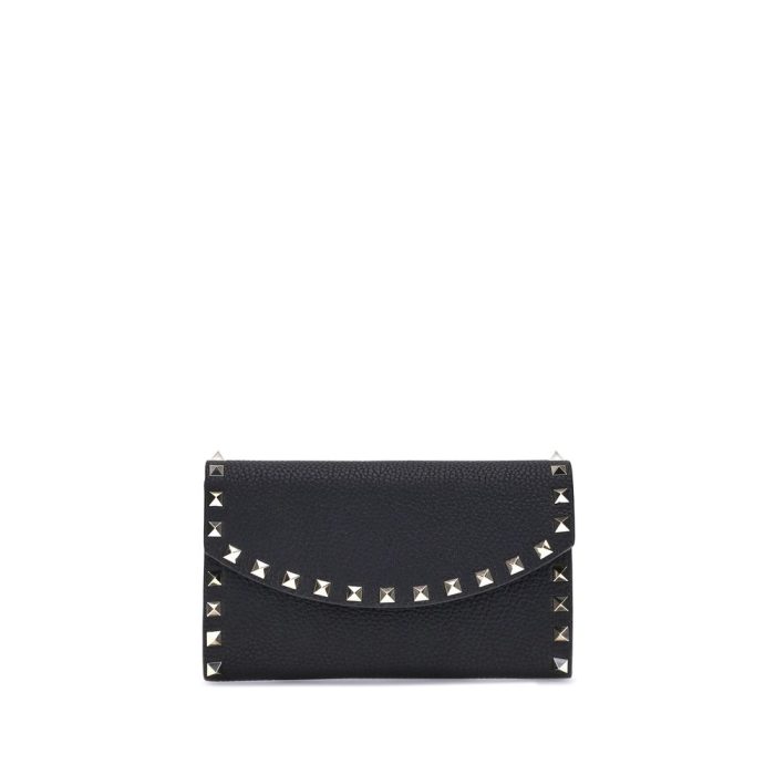 Valentino Garavani grained leather Wallet with removable chain shoulder strap for dual modes of use. Features front closure with magnetic flap and iconic Rockstud studs applied on the perimeter for a bold and elegant design. Inside, a single compartment with card slots to better organize your essentials.