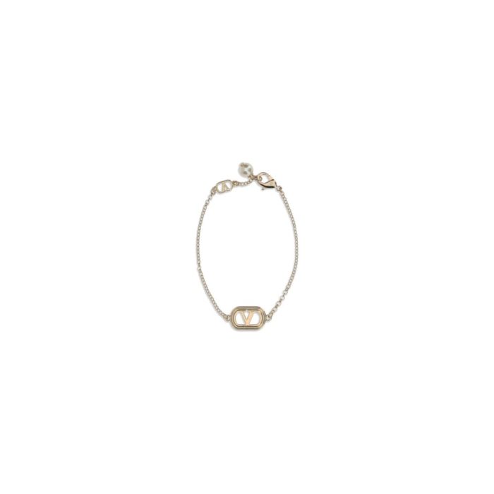 The Ovalette bracelet by Valentino Garavani is crafted in metal with a gold-tone finish and embellished with a Swarovski® pearl, adding a timeless touch of elegance to the design. The piece is completed with a practical lobster clasp, combining functionality and style.