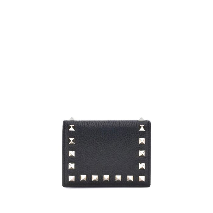 The Valentino Garavani Rockstud leather Wallet features card slots on the inside and a zippered coin purse for added convenience. The front flap and snap-button closure provides security, while the iconic Rockstud studs applied to the front and back add a bold and sophisticated touch, making this wallet a stylish and distinctive accessory.