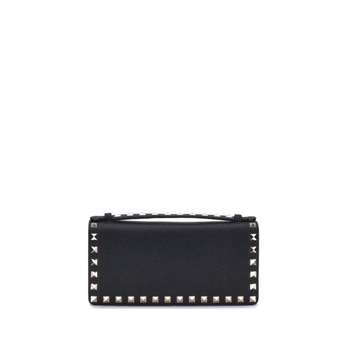 Valentino Garavani grained leather Wallet with top handle and chain shoulder strap for a dual mode of use. It features the iconic Rockstud studs applied on the perimeters and front flap closure equipped with a magnetic button. Inside, a single compartment with zippered welt pocket to better organize your essentials with style and functionality.