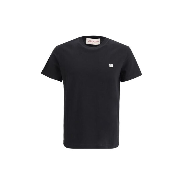 Cotton T-Shirt by Valentino, ribbed crew neck, contrasting applied iconic brand logo patch on front, monochrome pattern, regular fit.