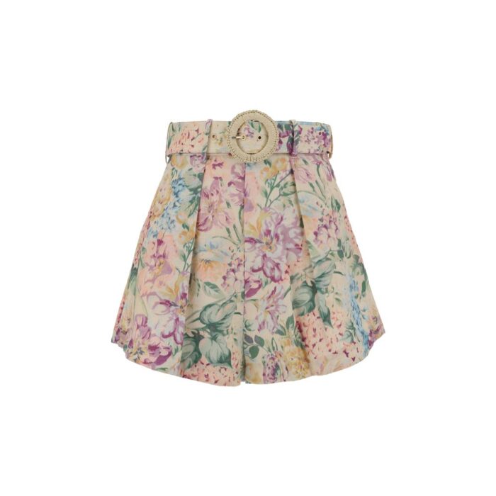 Cotton Halliday Tuck Bermuda Shorts by Zimmermann, two side welt pockets, concealed back zipper closure, removable and adjustable matching belt embellished with circular buckle, waistband loops, multicolored floral pattern, regular fit.