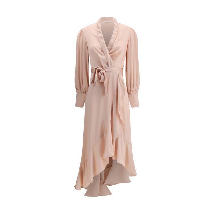 Zimmermann’s silk charmeuse wrap Dress is an elegant interpretation of the classic wrap dress, enhanced by sophisticated details and a flowing silhouette. The wrap design enhances the figure, while the shawl collar and V-neck add a touch of understated femininity. The side tie fastening allows for a natural fit adjustment. Long jacket-effect sleeves with zippers at the cuffs introduce a contemporary element, balanced by the delicate gathered trim. The asymmetric hemline and mid-length complete a refined and versatile garment, perfect for special occasions or striking evening looks.